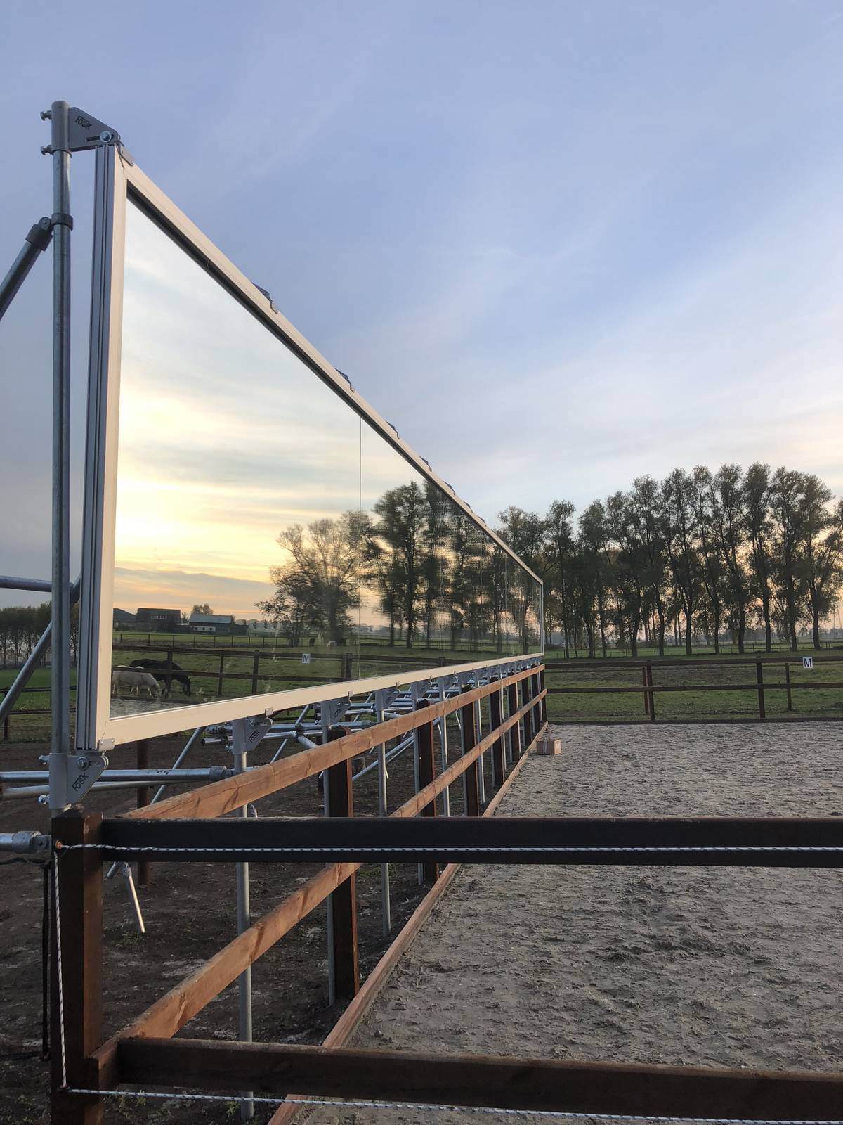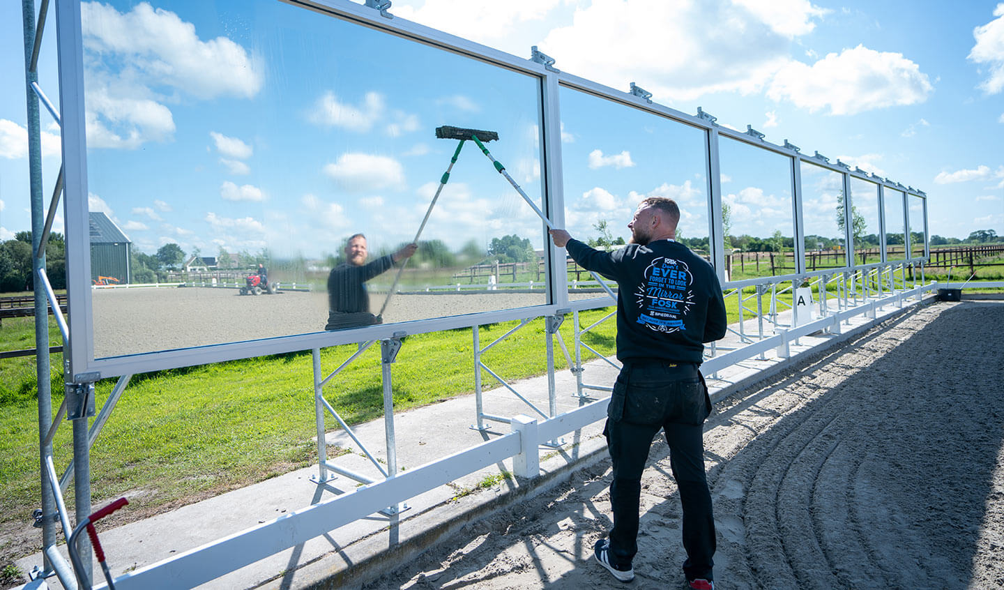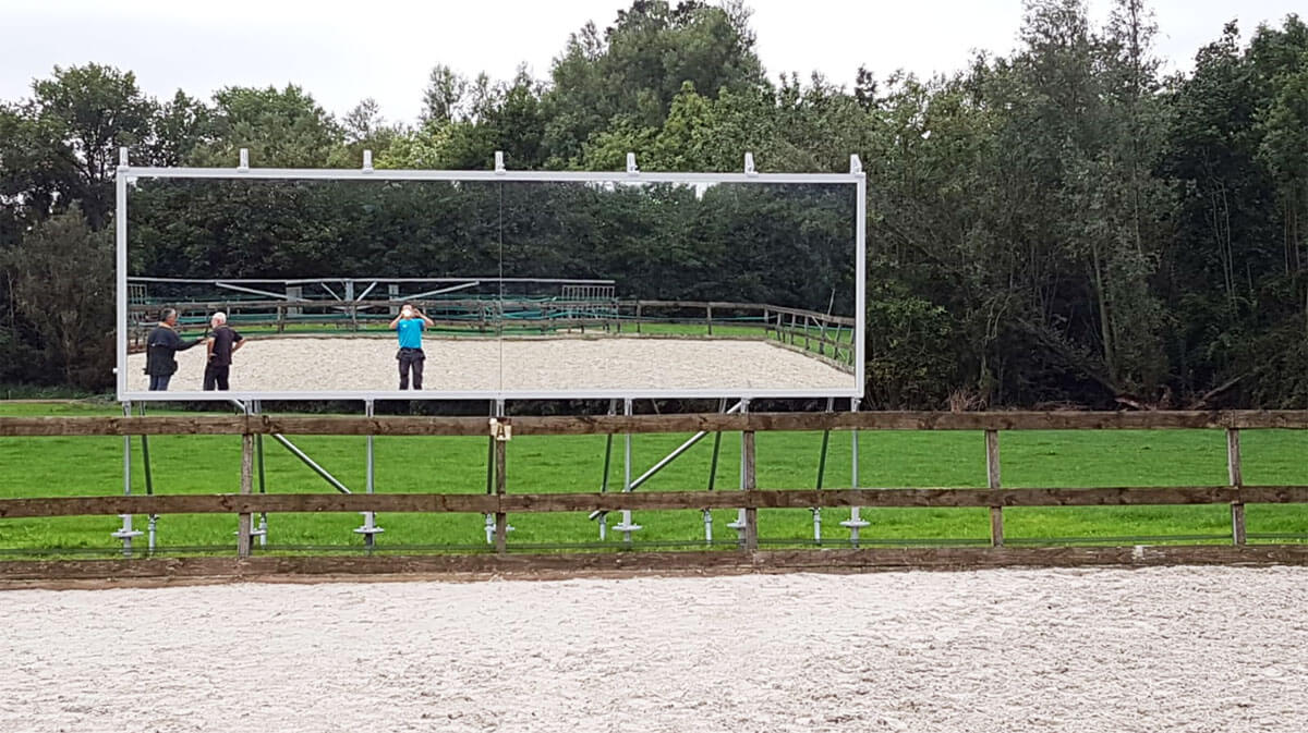 Nach welcher Art von Spiegel sind Sie auf der Suche? Wir liefern Reitspiegel in jeder Größe und in jedem Format. Egal, ob Sie einen kleinen Spiegel oder eine vollständige Spiegelwand für Ihre Reithalle wünschen, bei uns werden Sie fündig. Jeder unserer Spiegel besteht aus einem oder mehreren Spiegelteilen mit einer Höhe von je 1,70 m. Wir setzen unsere Spiegelteile in ein Aluminiumprofil, das in eine stabile und sichere Konstruktion montiert wird. Diese Art von Konstruktion ist perfekt auf die auf die Bedingungen einer Reithalle oder eines Reitplatzes zugeschnitten.